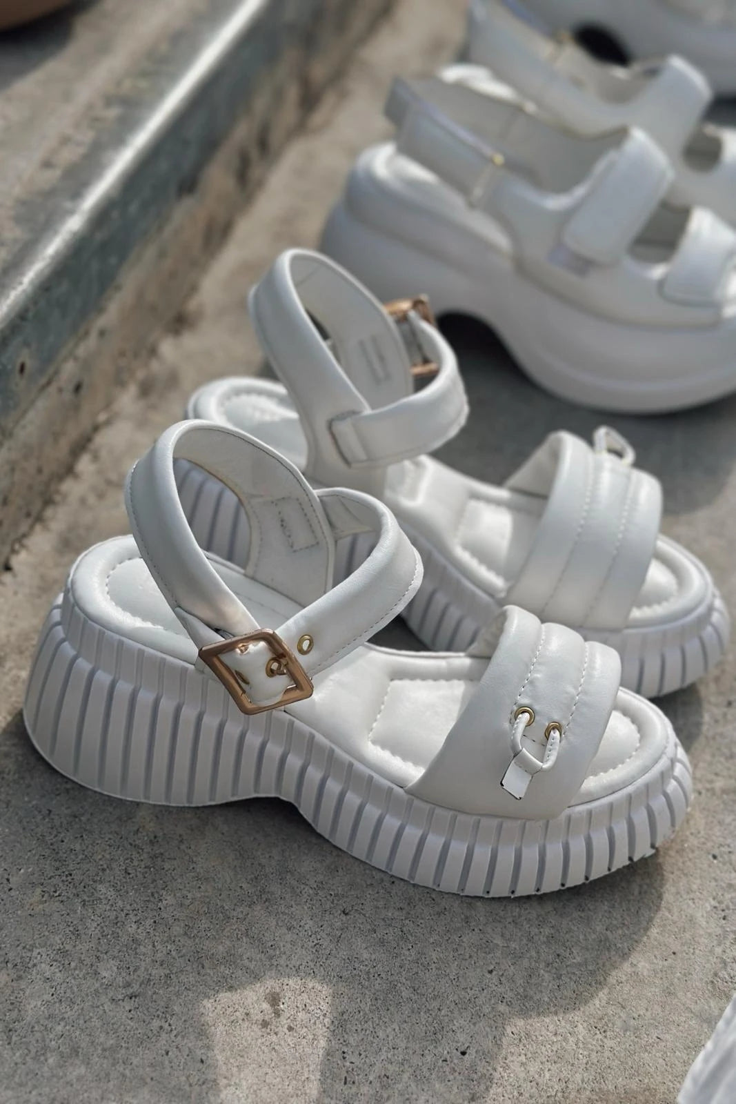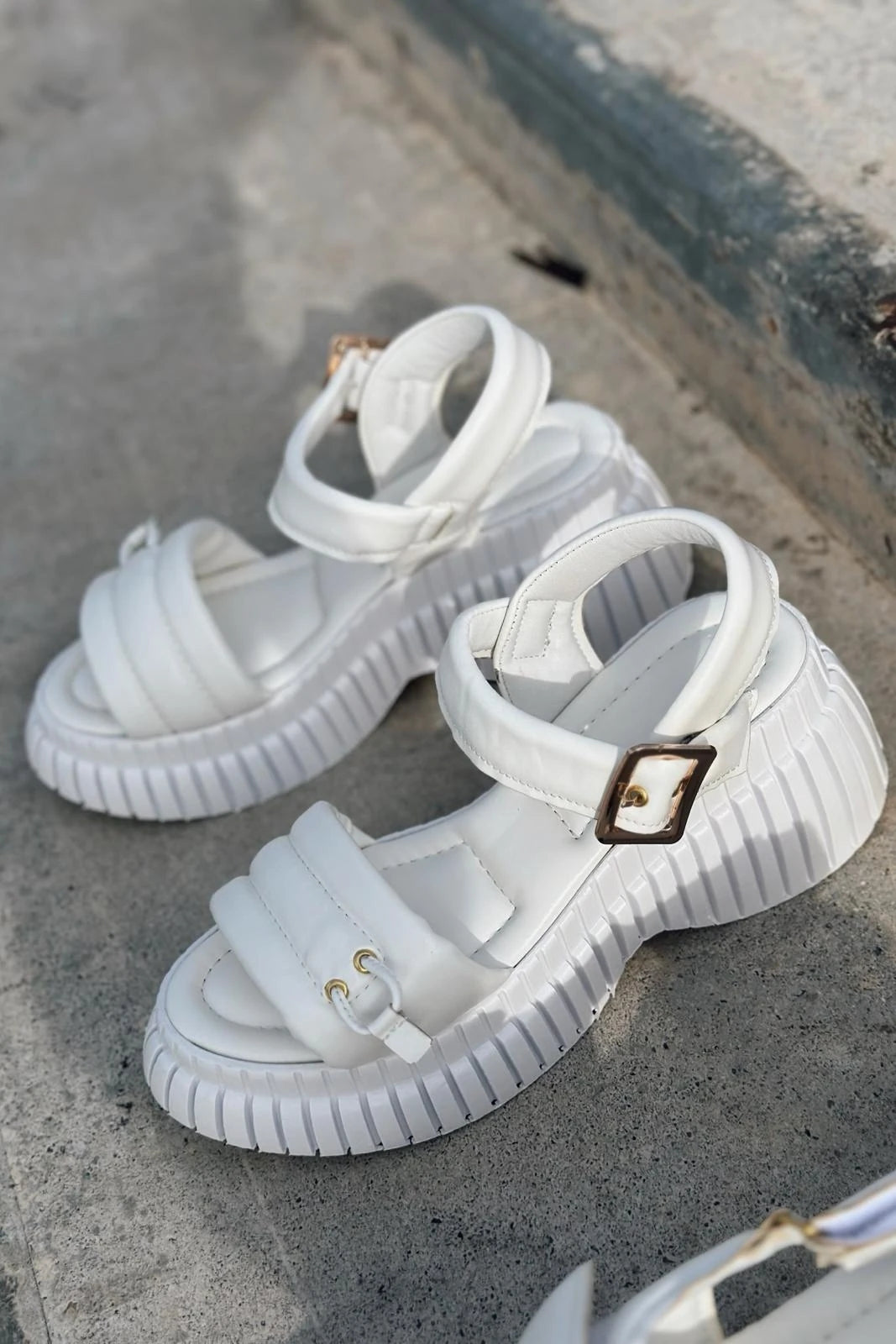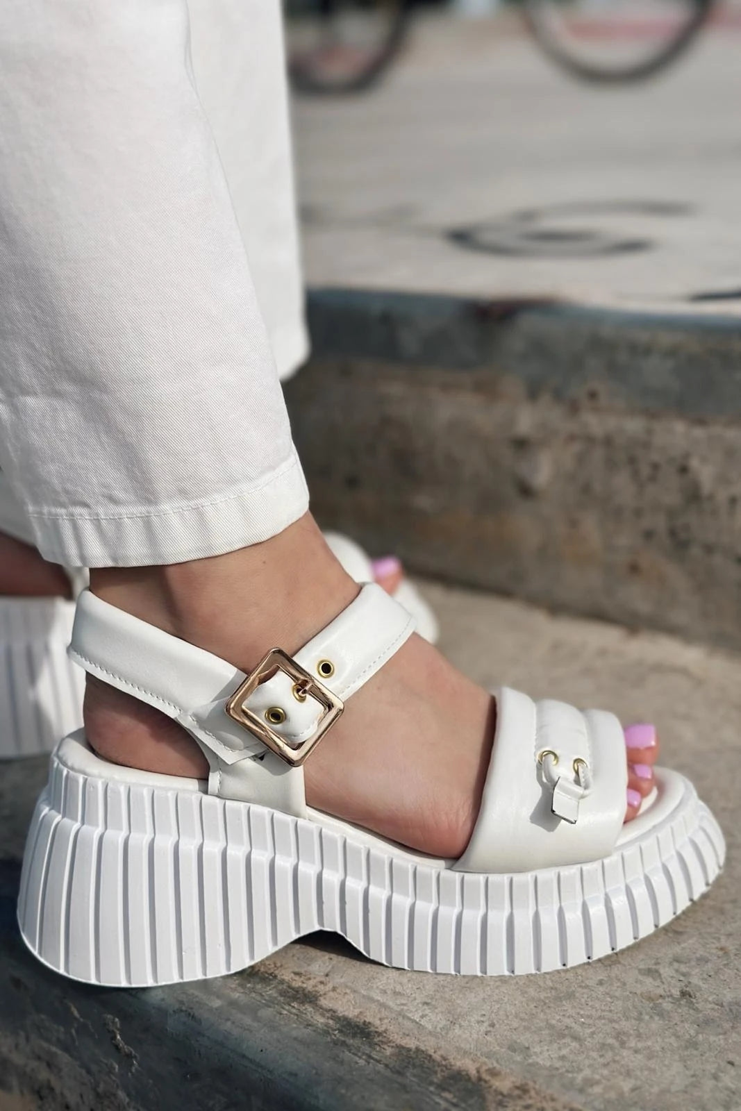 Jonix Mat Deri Kalın Taban Kadın Sandalet Beyaz - ILOVESHOES