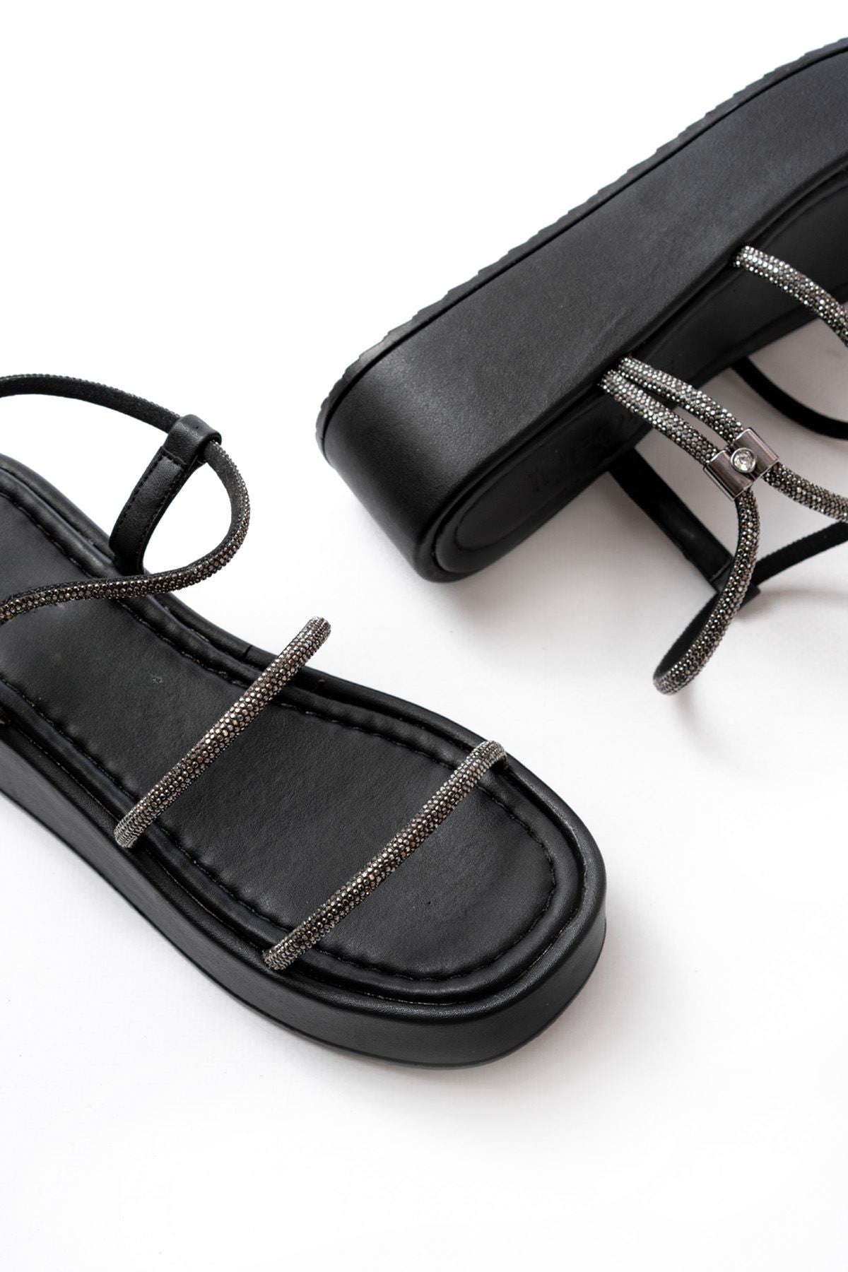 Lenyor Mat Deri Siyah Platin Taş Bantlı Kadın Sandalet