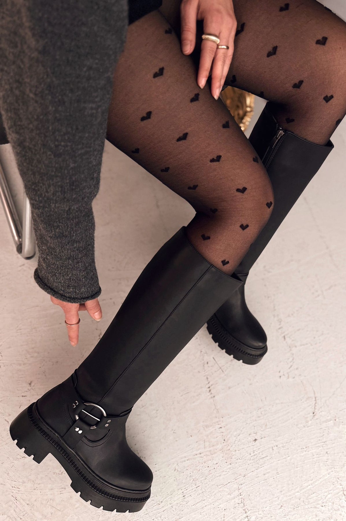 - Siyah mini etek ve desenli çoraplarla feminen bir stil oluşturun.