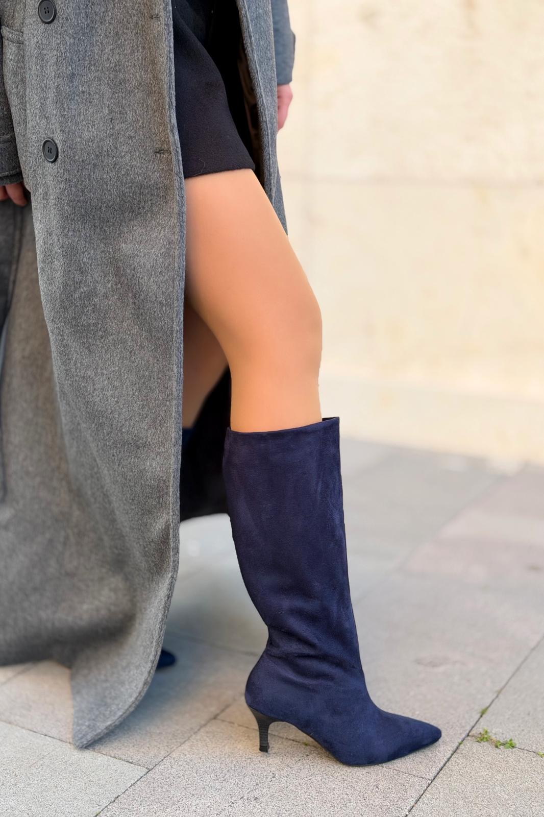 Remni Kadın Topuklu Çizme Lacivert Süet - ILOVESHOES
