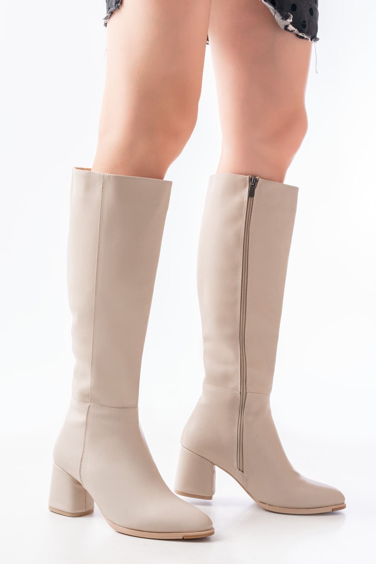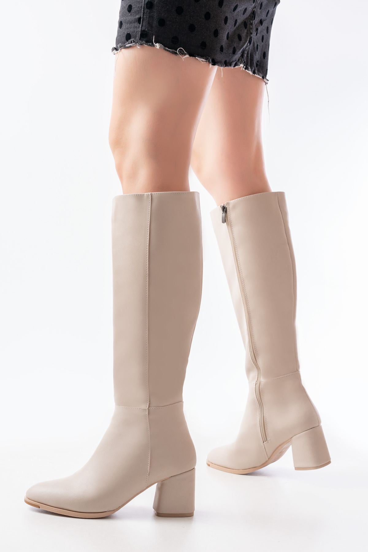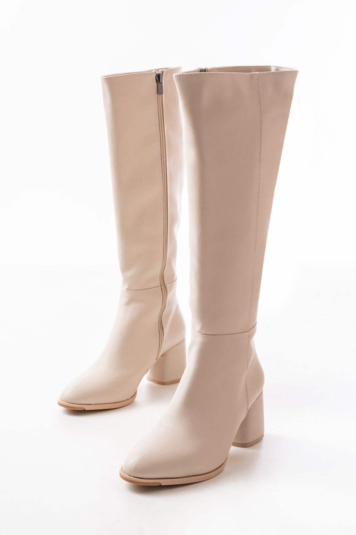 Taferso Bej Topuklu Fermuarlı Günlük Kadın Çizme