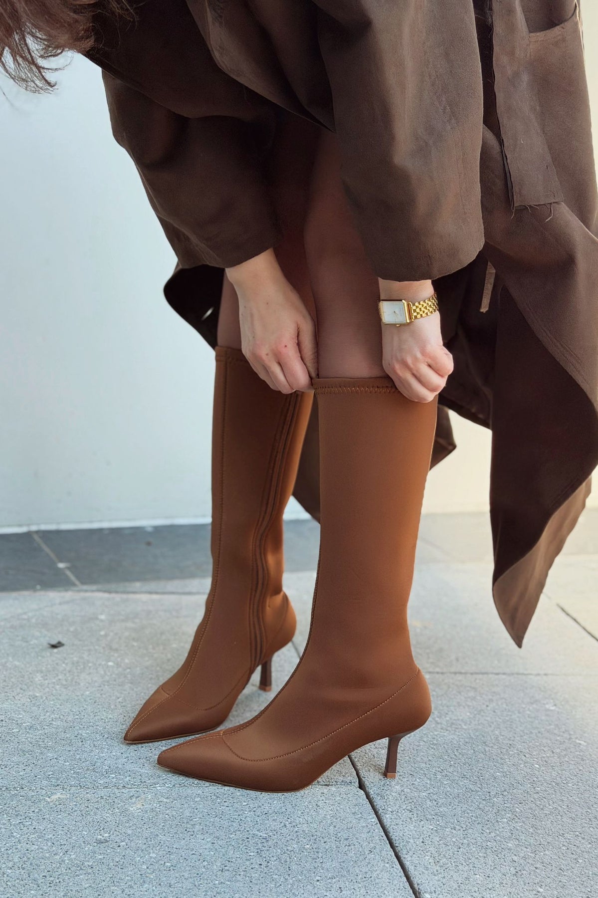 Ralve Kadın Topuklu Streç Çizme Taba Dalgıç Kumaş - ILOVESHOES