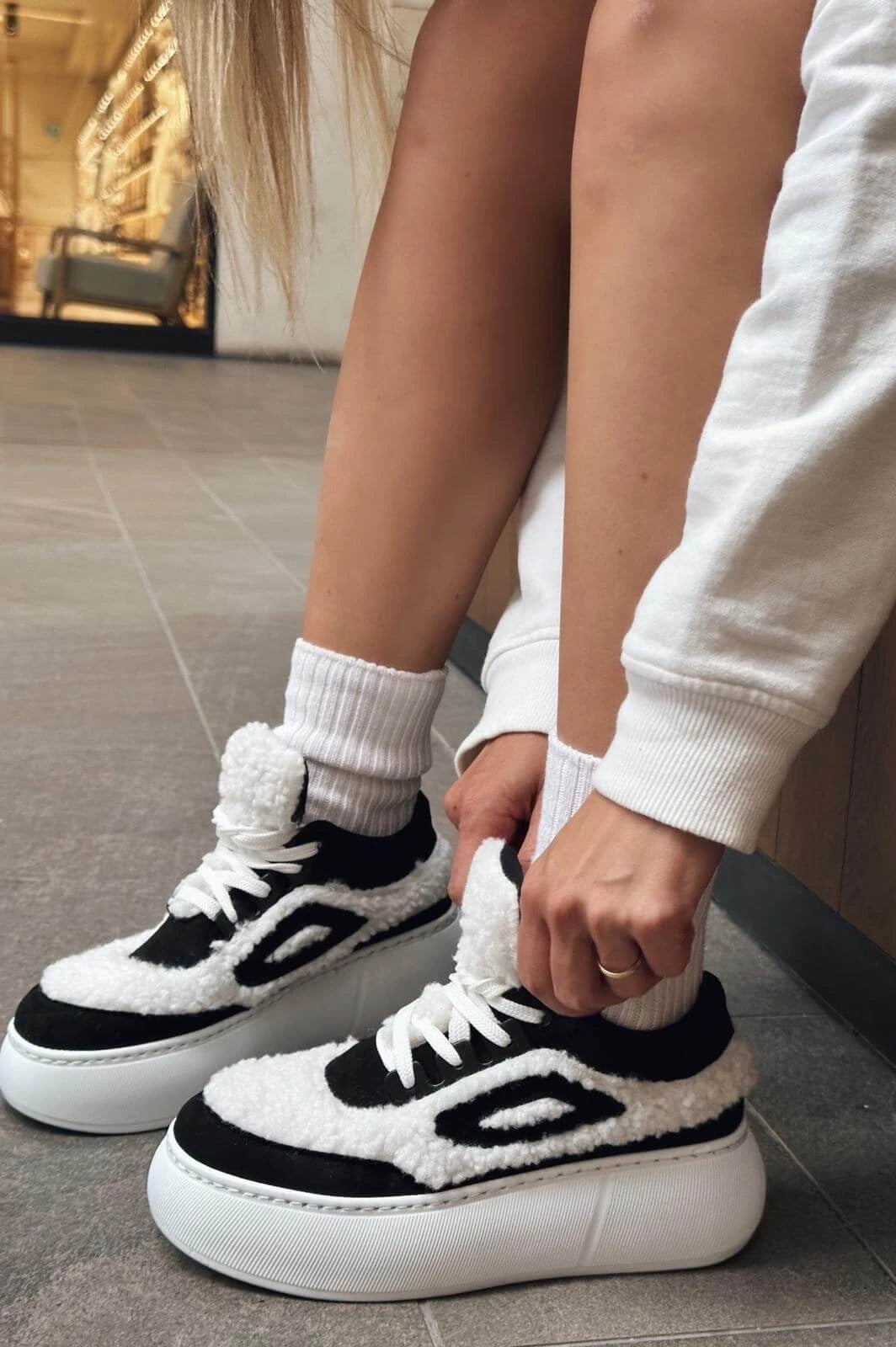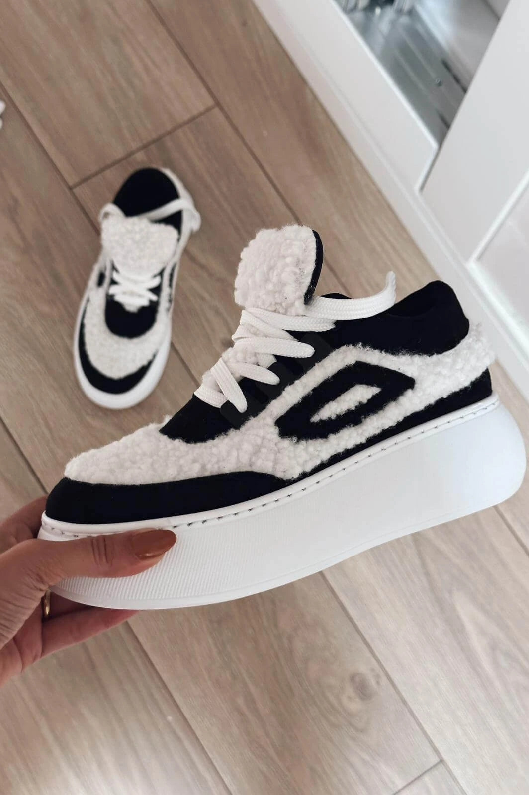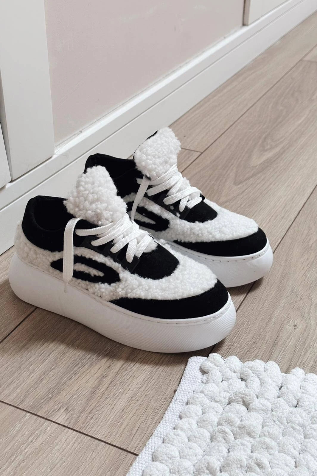 Poffy Peluş Kalın Taban Kadın Spor Ayakkabı Siyah-Beyaz