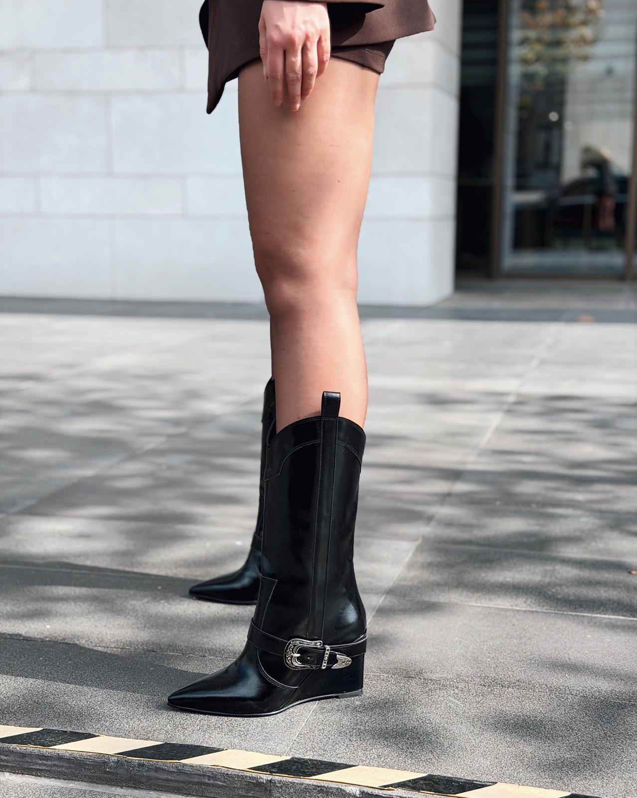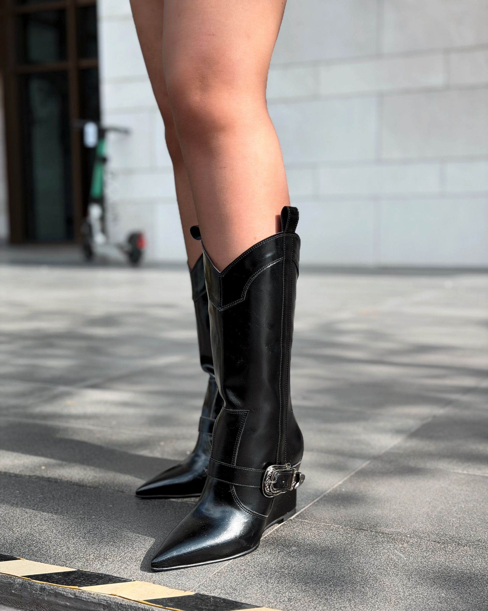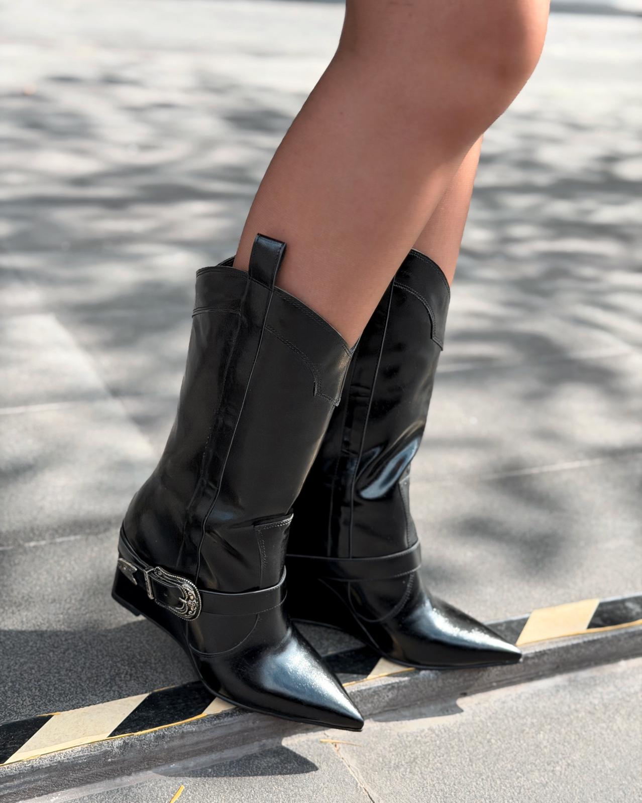 Bonvir Kadın Kovboy Çizme Siyah Parlak Deri