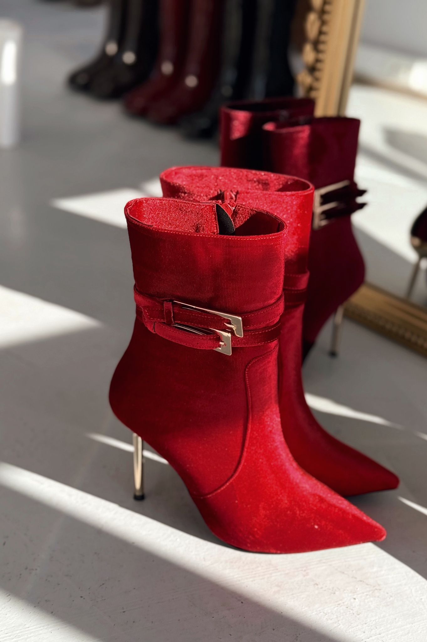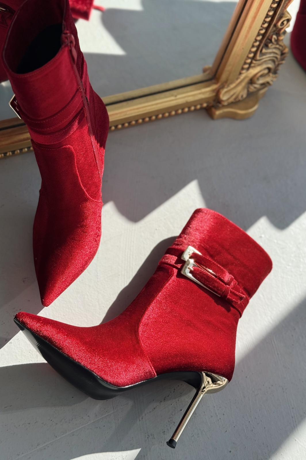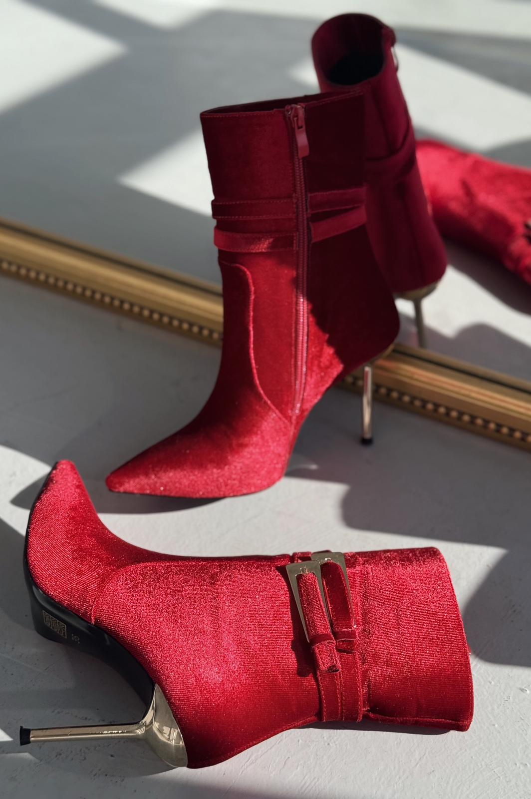 Calindo Kadife Toka Detaylı Kırmızı Kadın Topuklu Bot