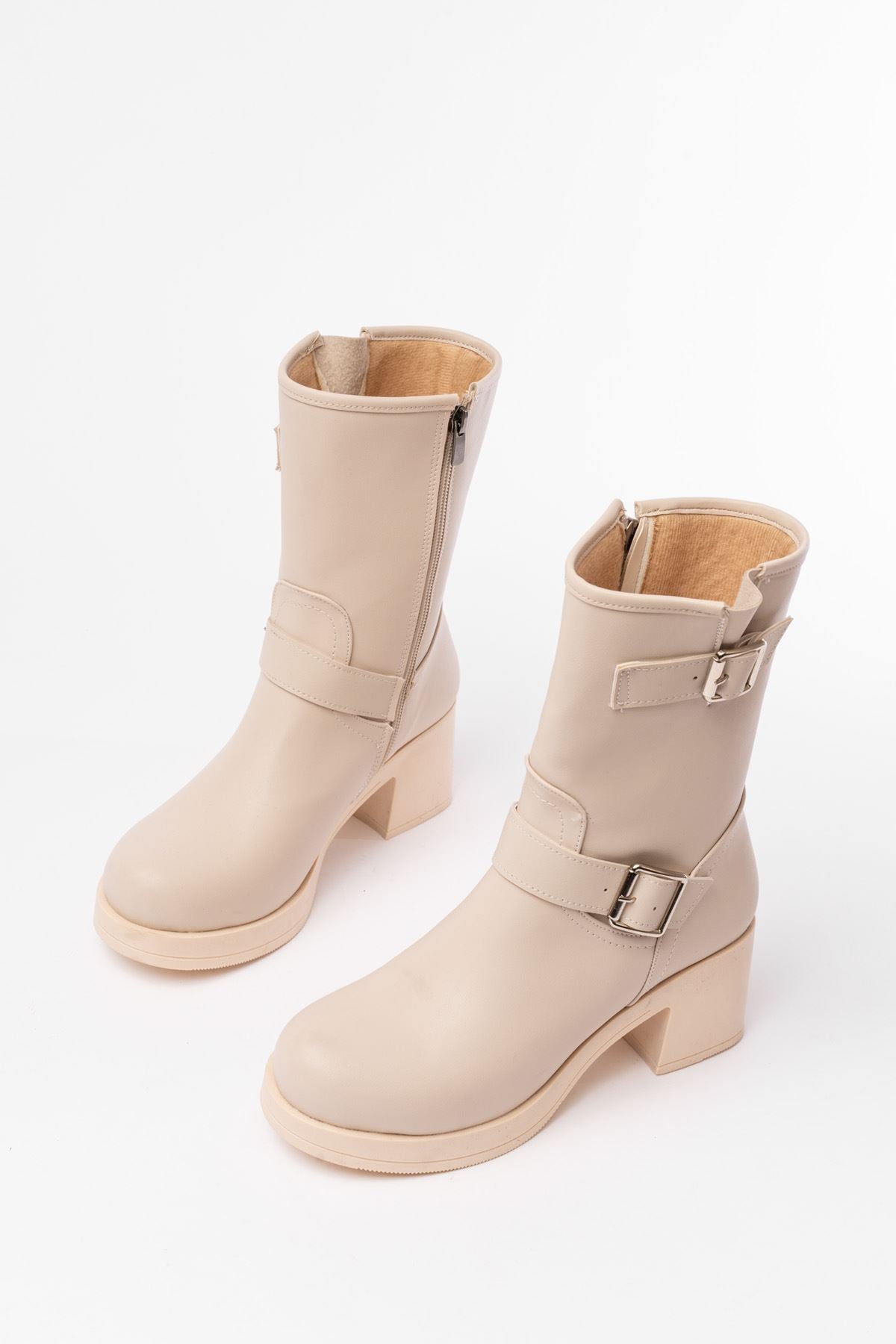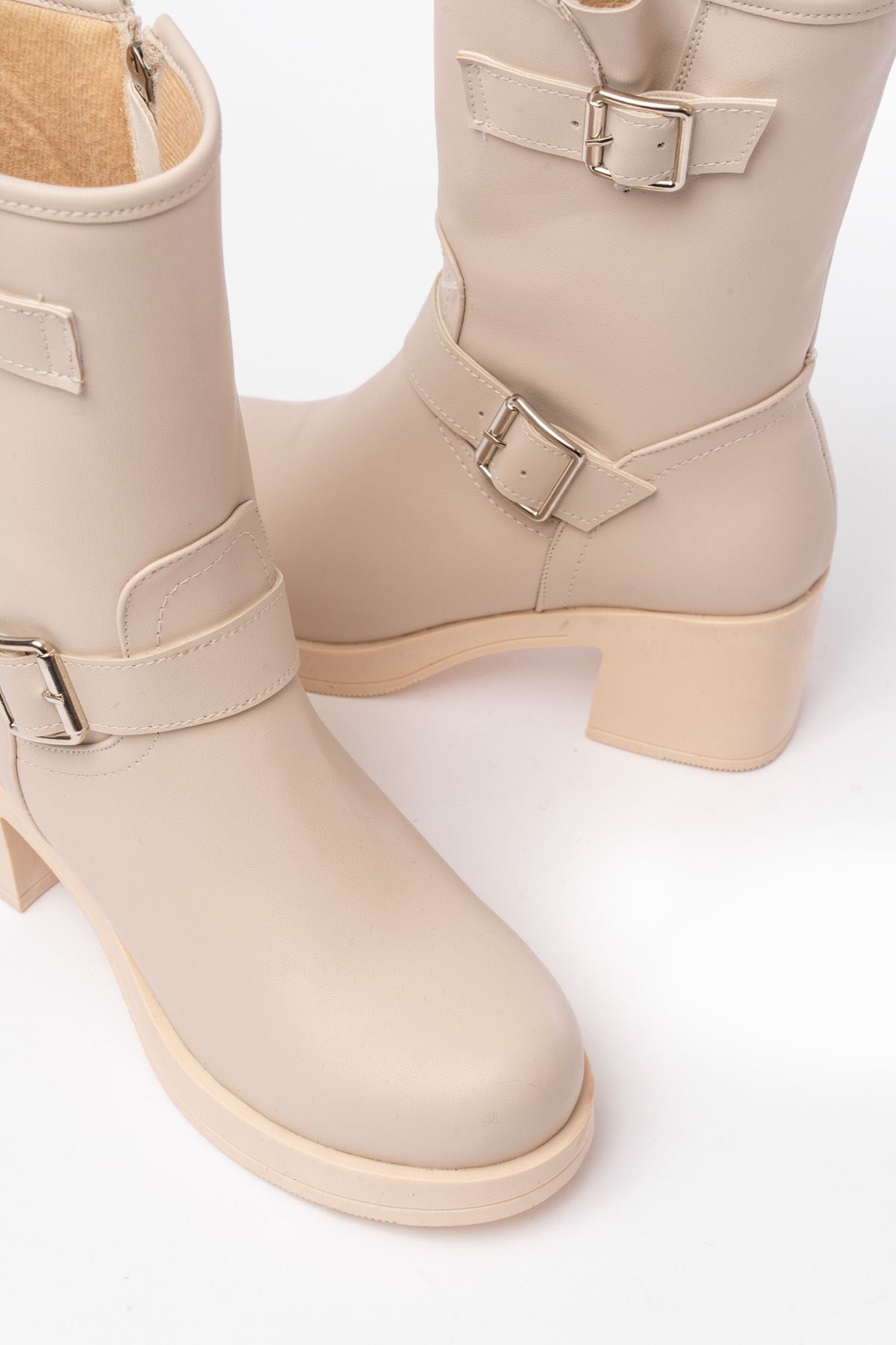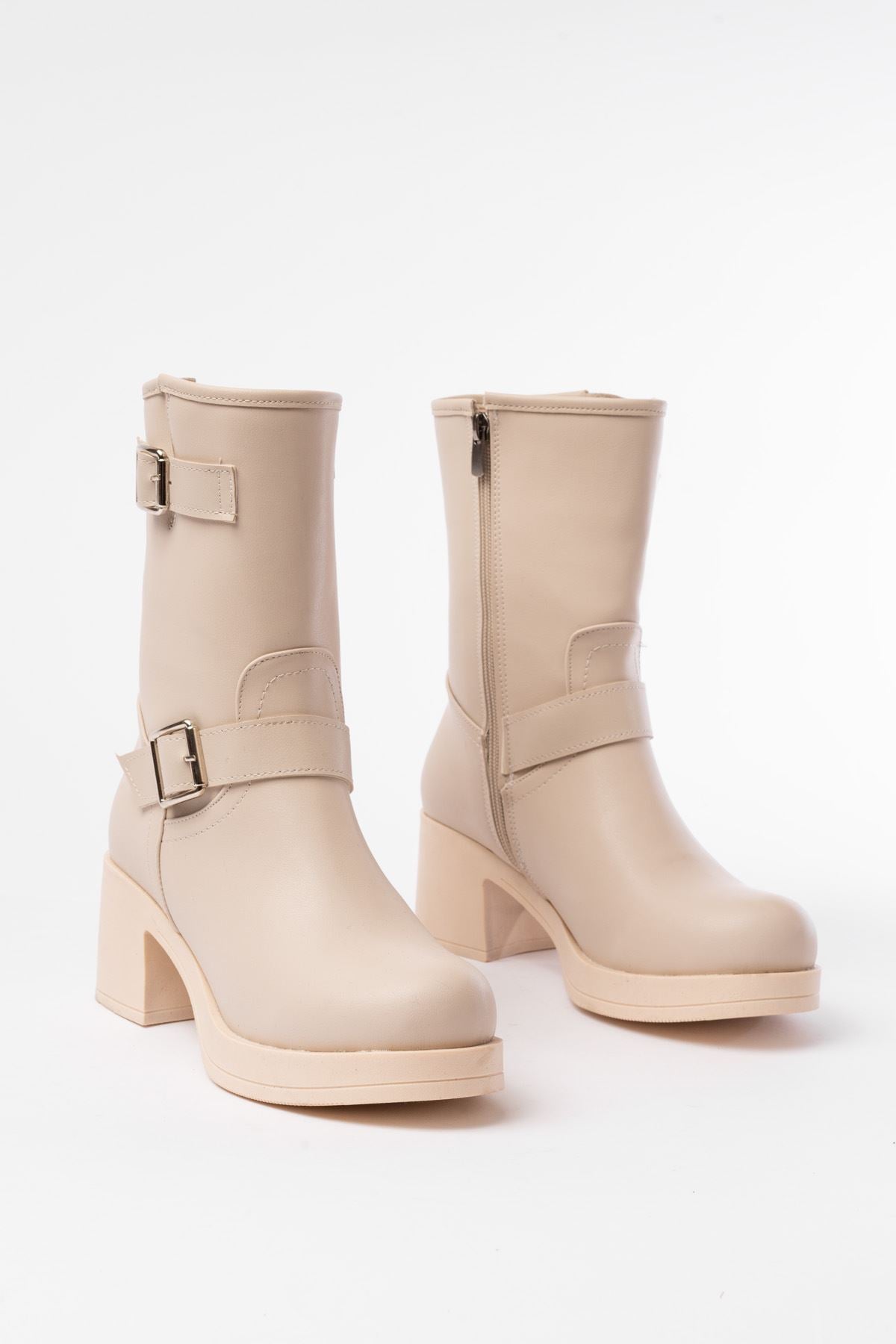 Kalora Bej Toka Aksesuarlı Fermuarlı Kalın Topuklu Günlük Kadın Bot