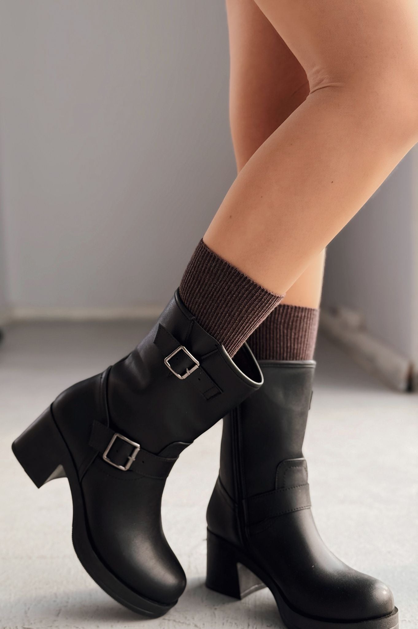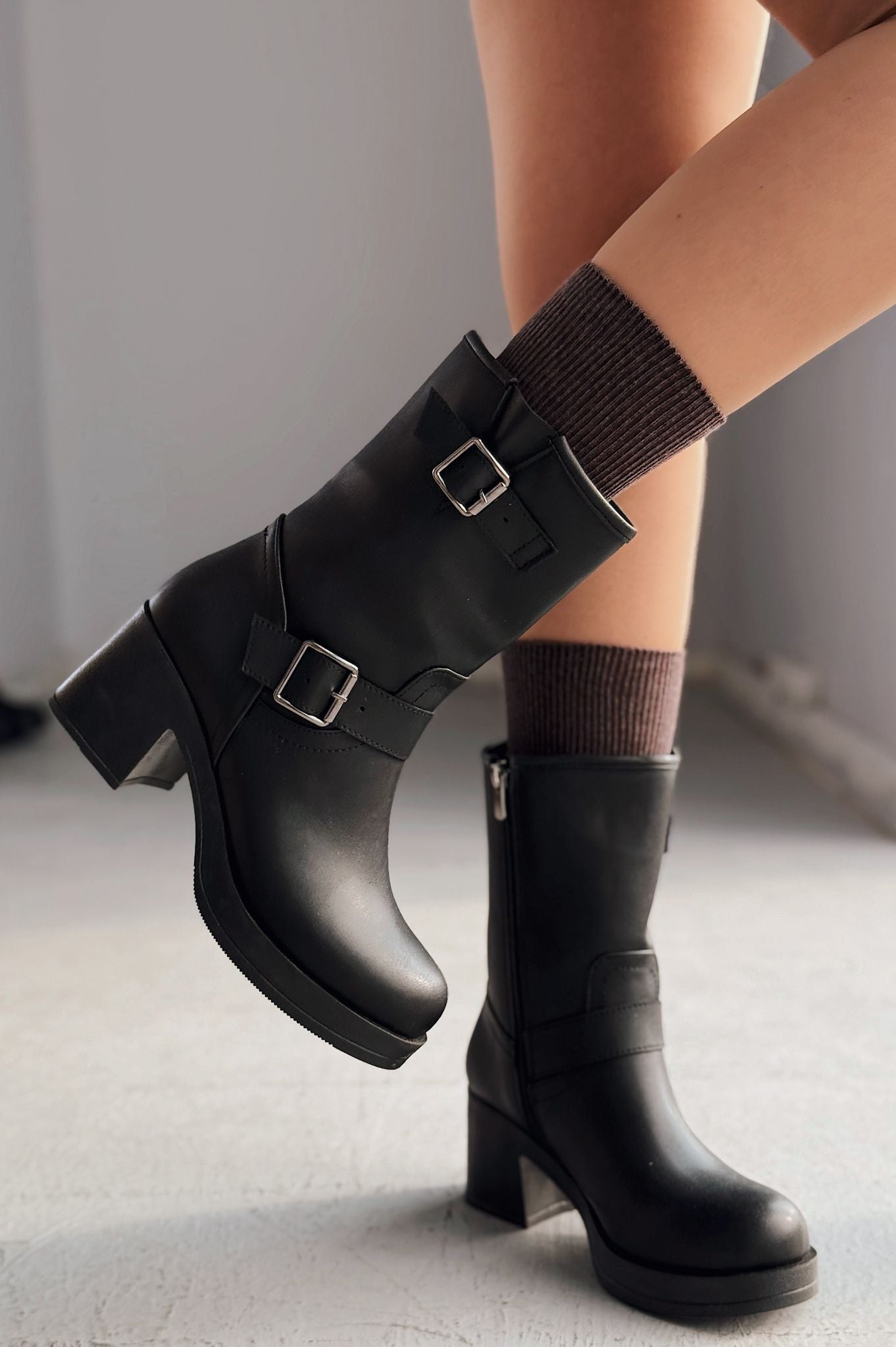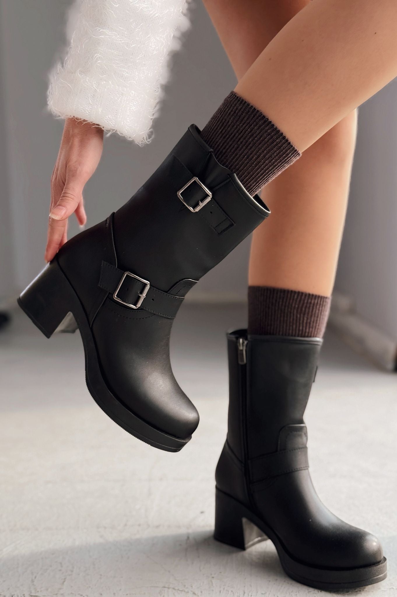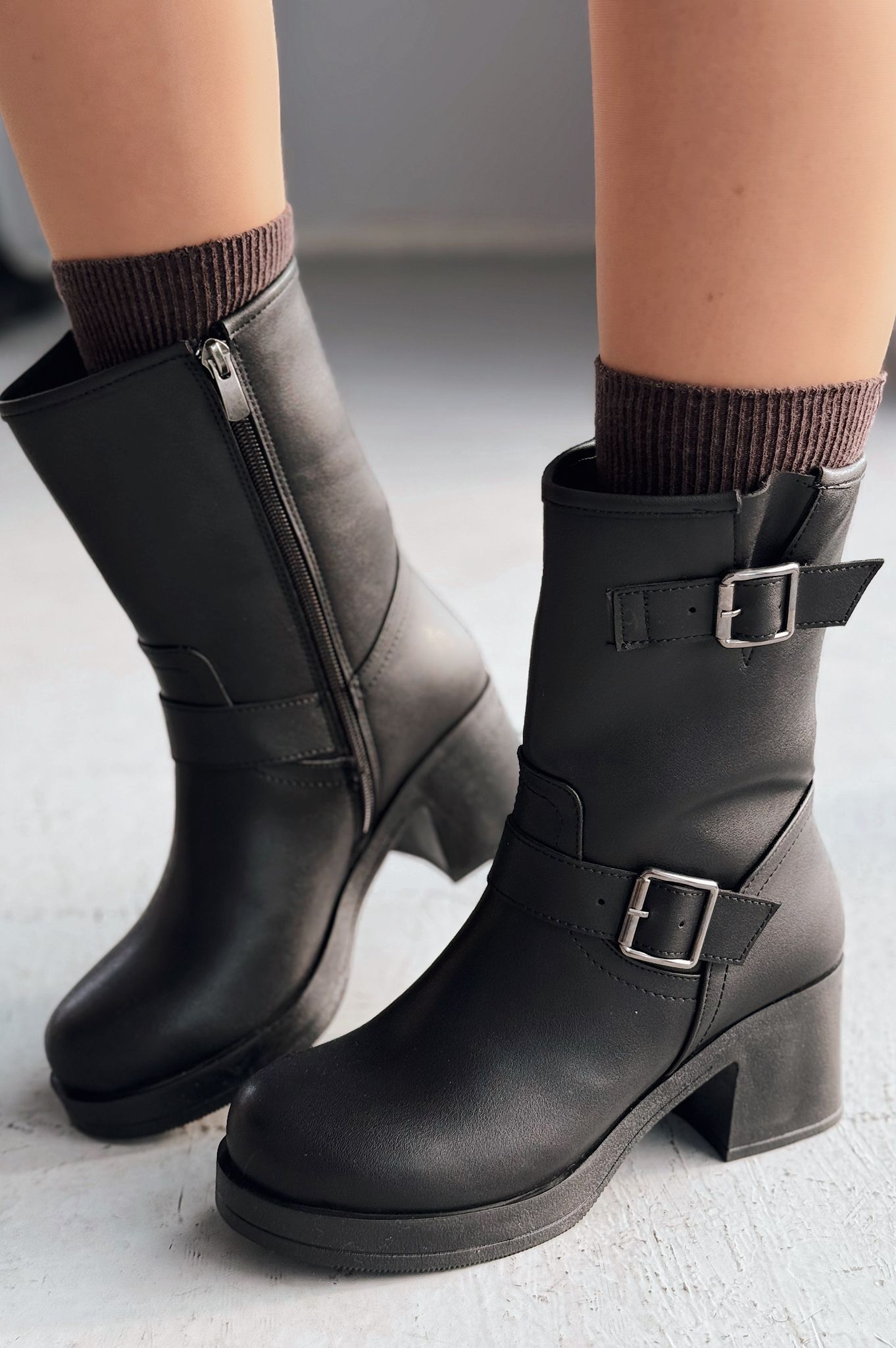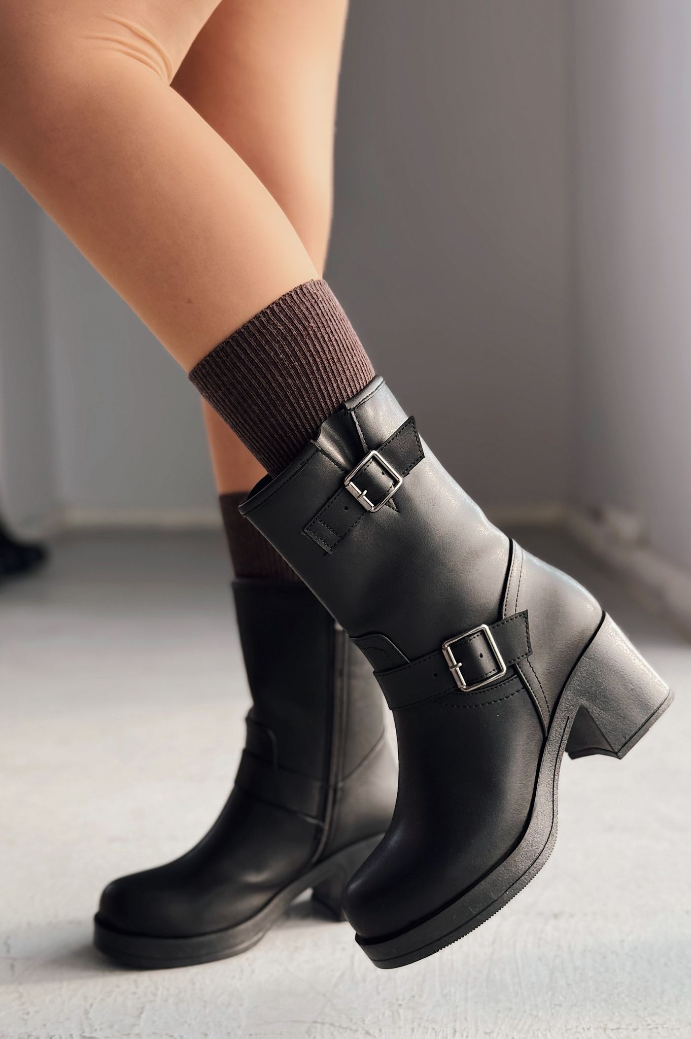 Kalora Siyah Toka Aksesuarlı Fermuarlı Kalın Topuklu Günlük Kadın Bot