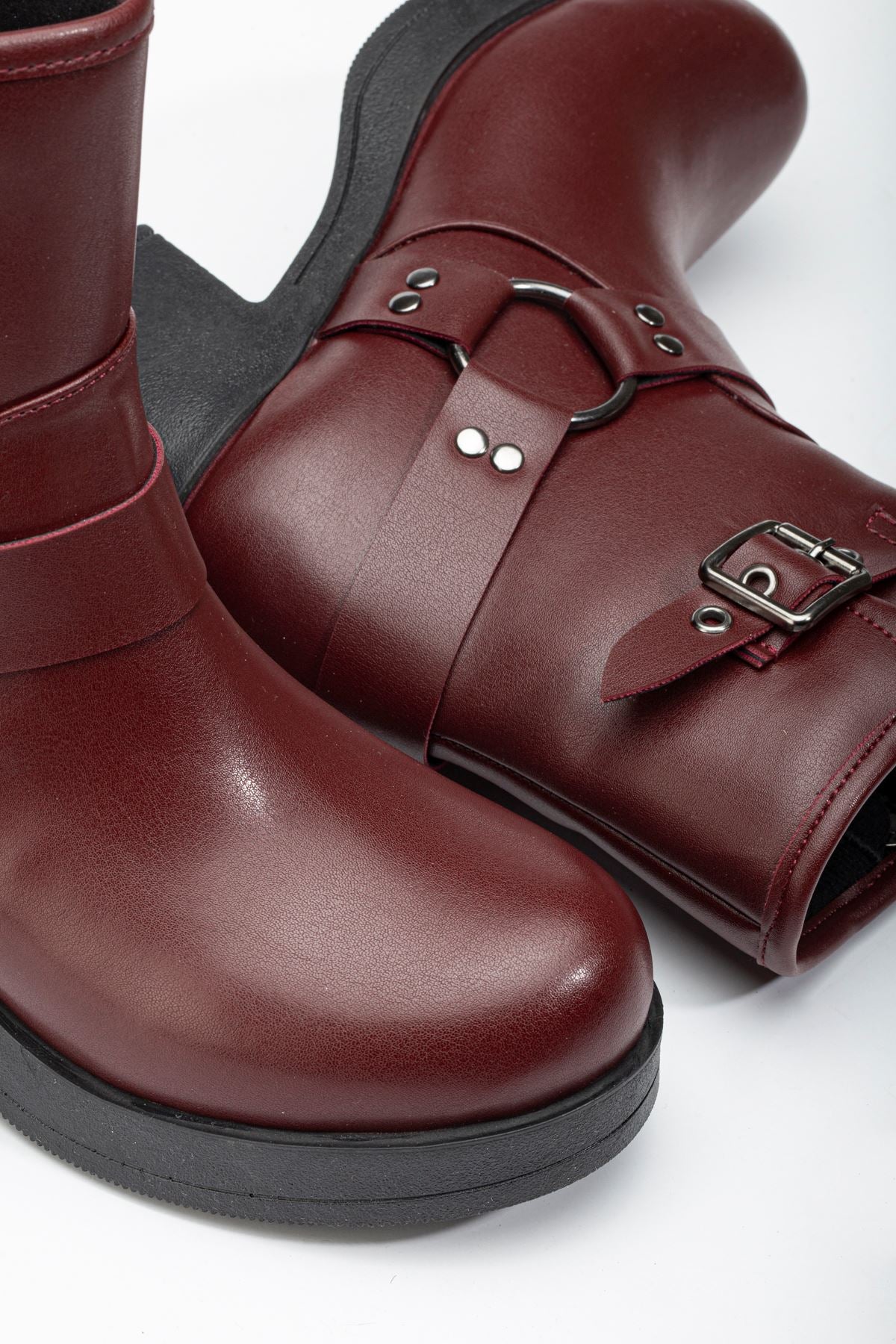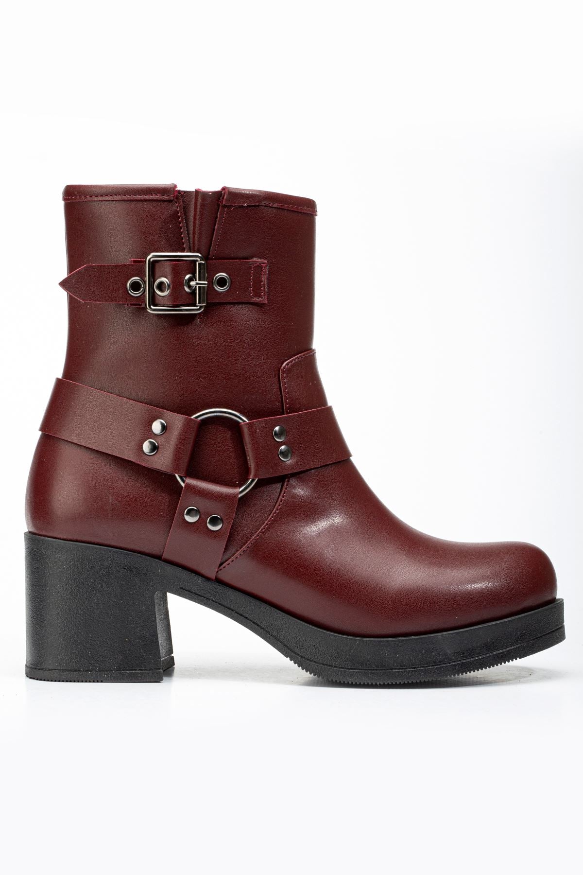 Lobixa Bordo Toka Aksesuarlı Fermuarlı Kalın Topuklu Günlük Kadın Bot