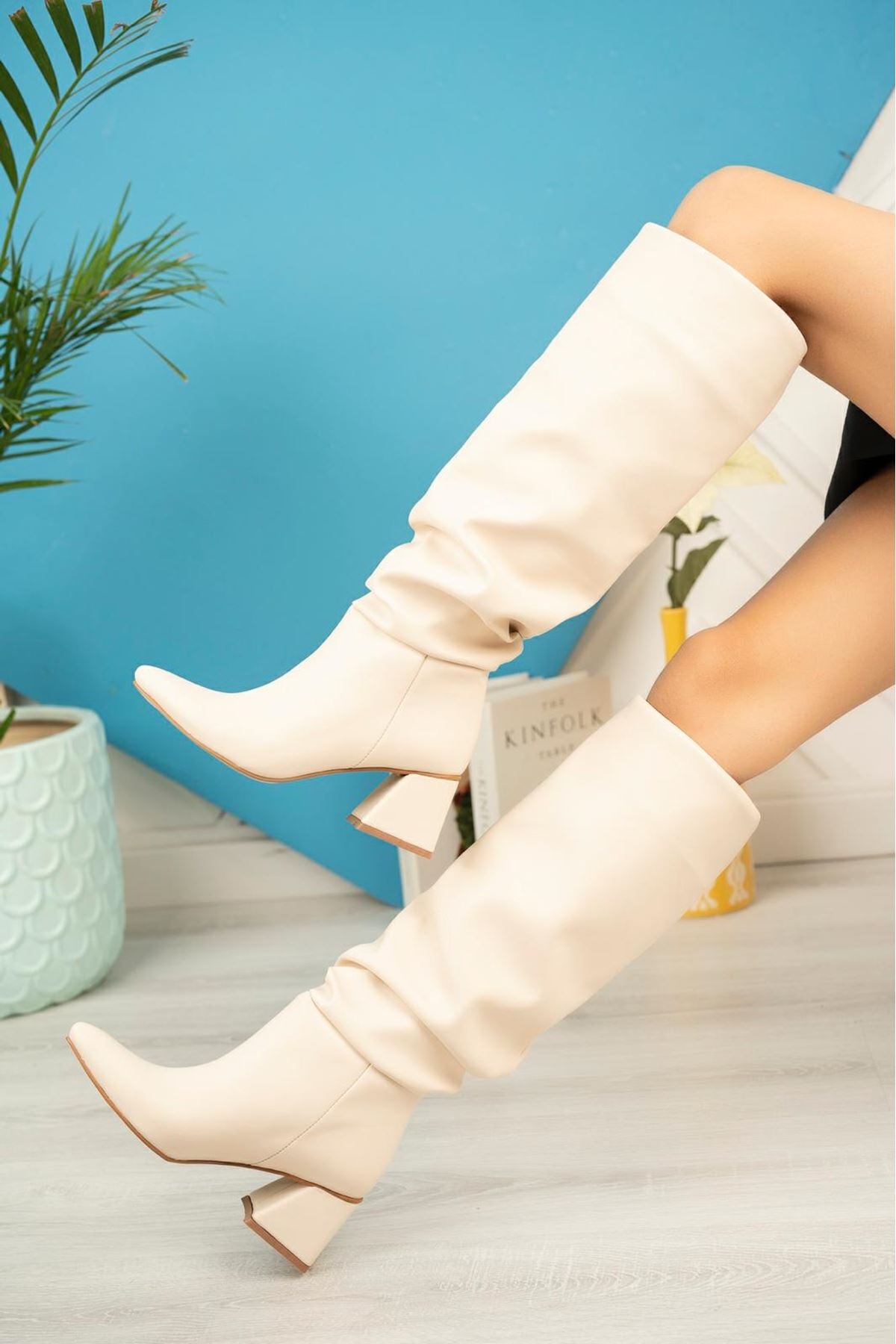Nexari Bej Körüklü Kalın Topuklu Günlük Kadın Çizme