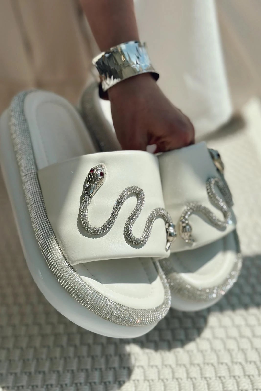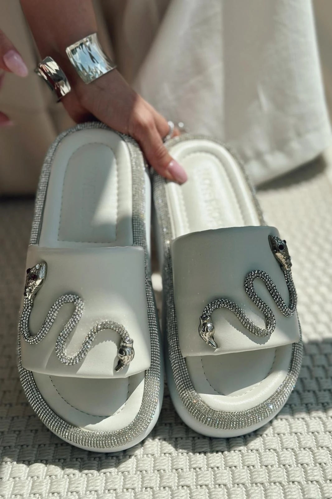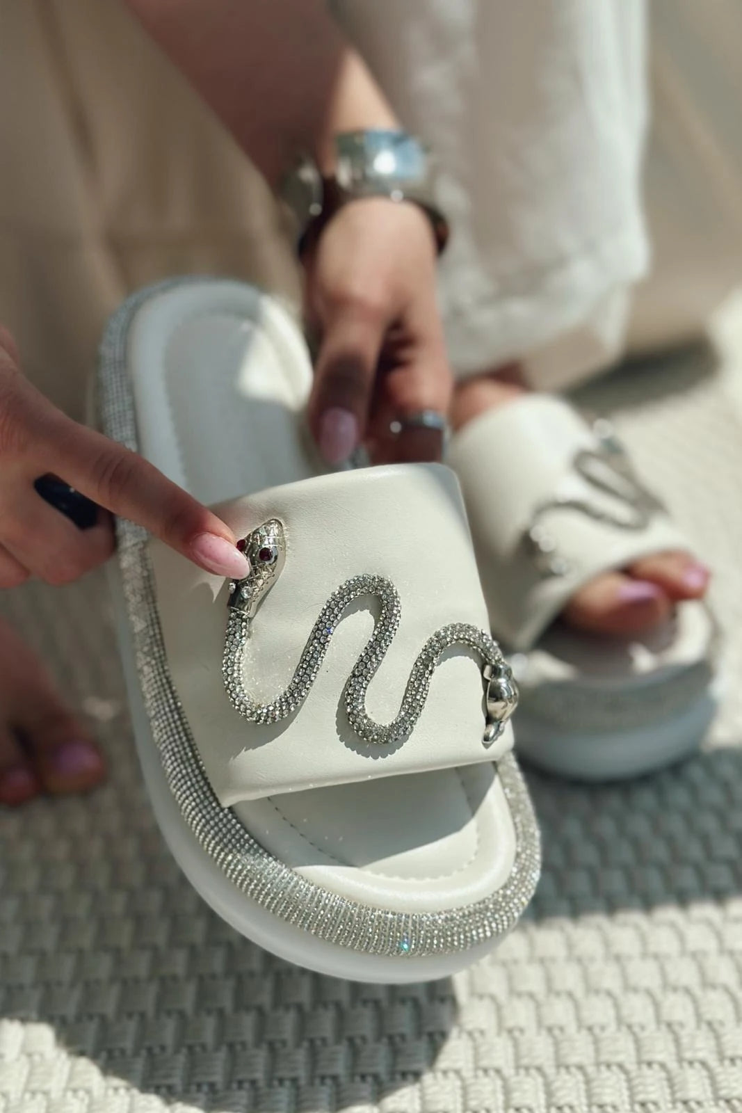 Nokest Mat Deri Taş Detaylı Kadın Terlik Beyaz
