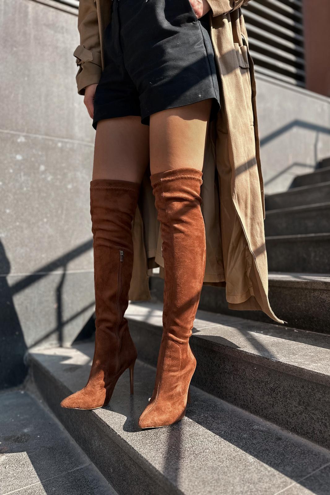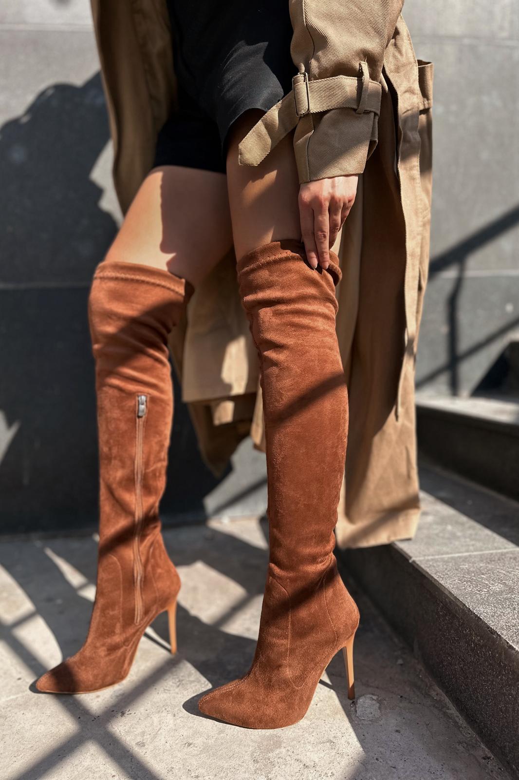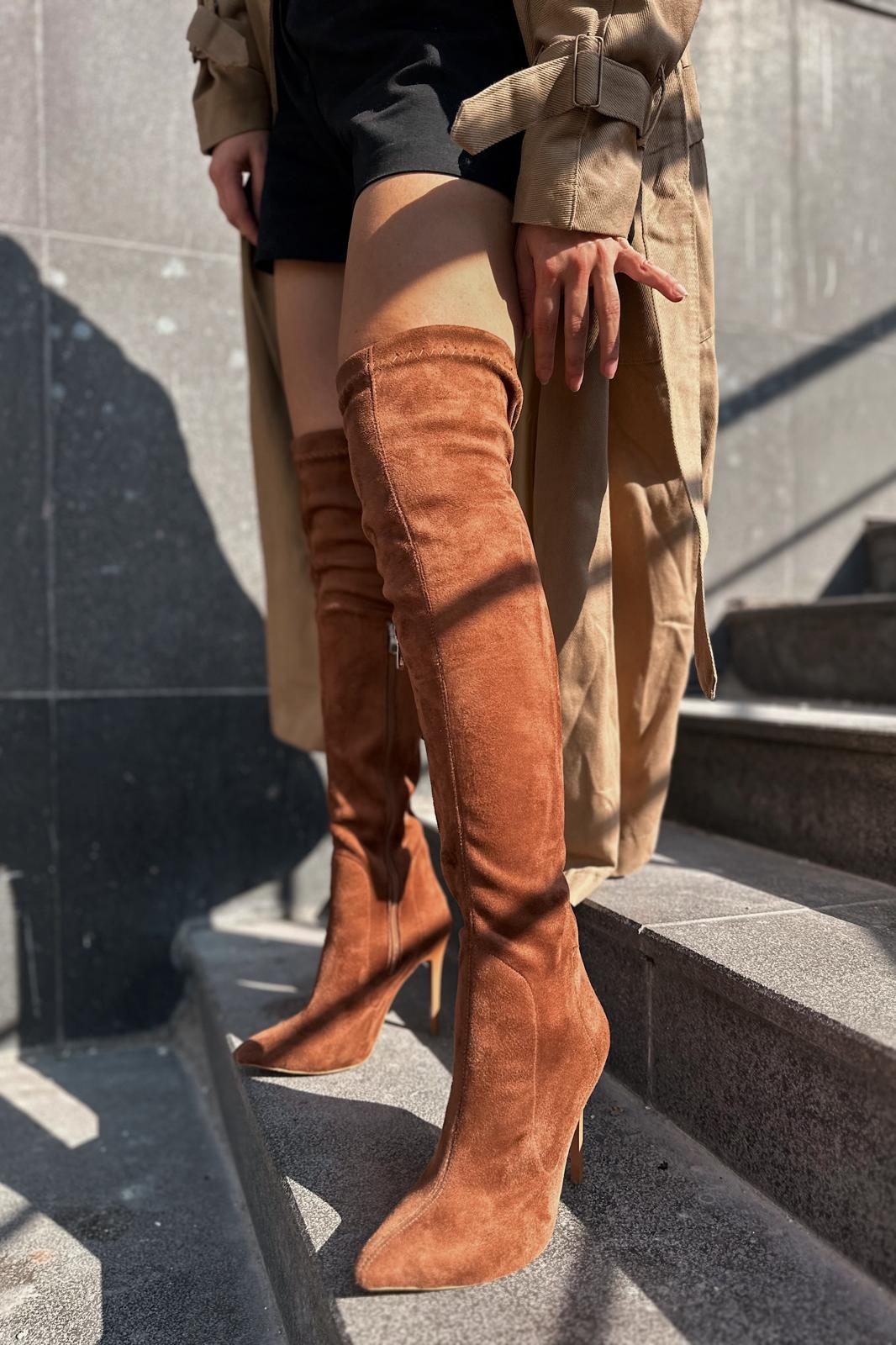Padsev Süet Streç Diz Üstü Kadın Çizme Taba