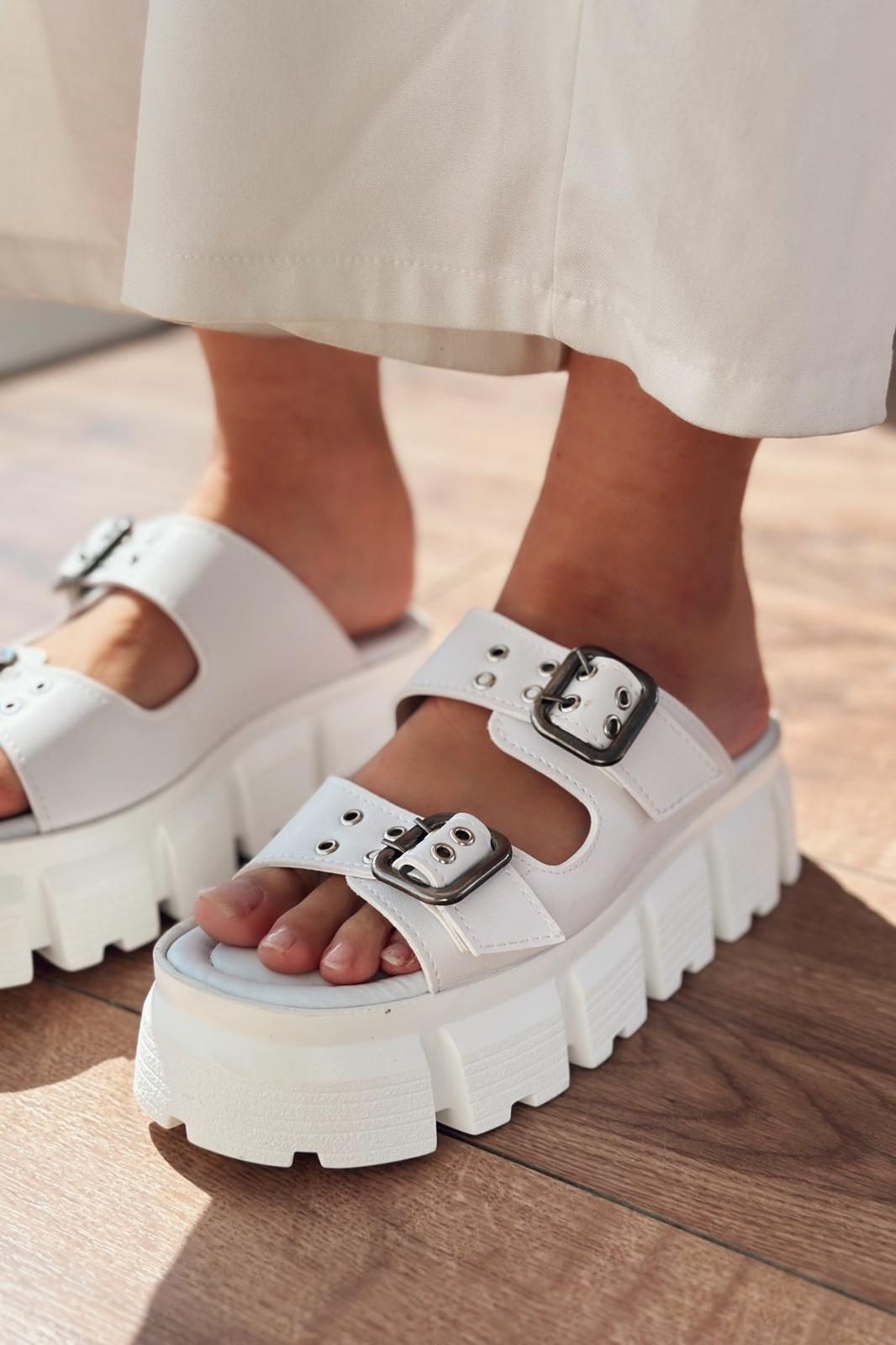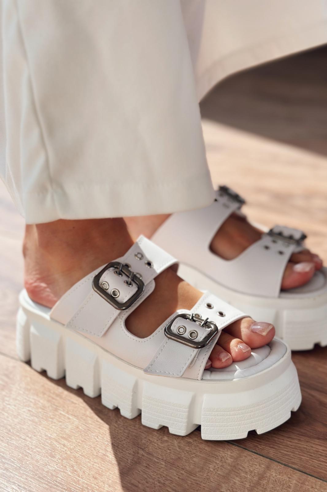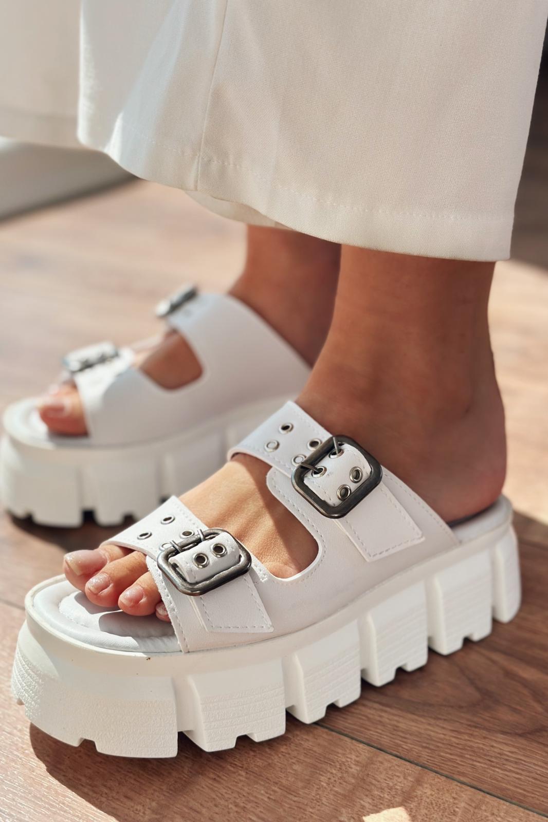 Ratey Mat Deri Toka Detaylı Kadın Terlik Beyaz